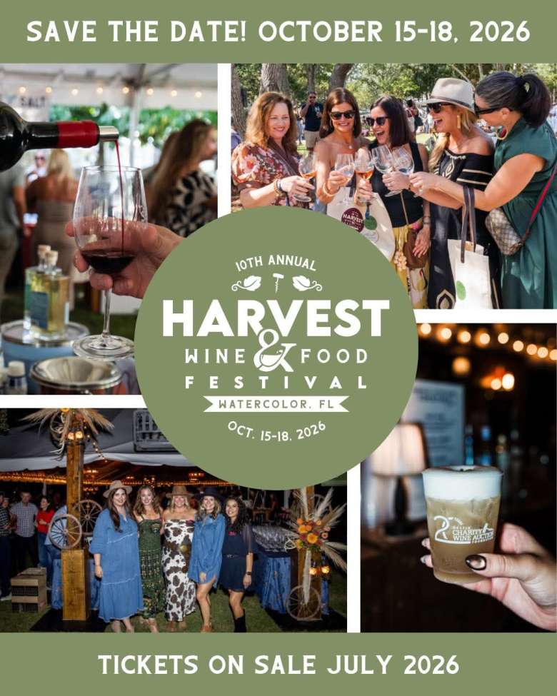 Welcome to 10th Annual Harvest Wine and Food Festival weekend in WaterColor, Florida. Held October 15 - 18, 2026, the Grand Tasting takes place on Saturday, October 17th in Cerulean Park from 1 - 4PM. More information at harvestwineandfood.com.
