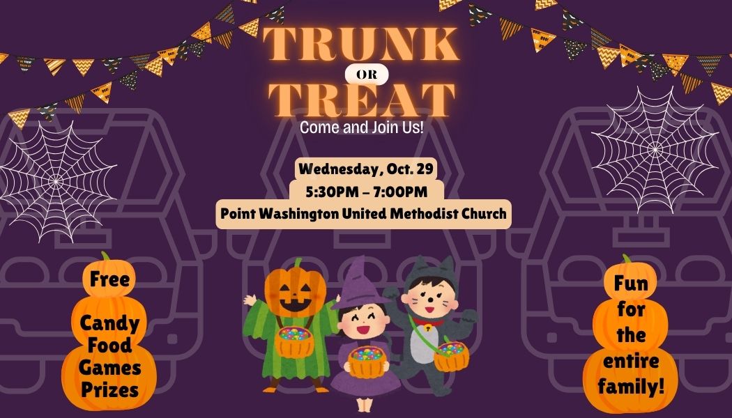 Everyone's invited to our big Trunk or Treat event at Point Washington United Methodist Church Wednesday, October 29 from 5:30 - 7:00 p.m. Free food, CANDY, carnival games with prizes, hay rides and more! PWUMC is located at 1290 N. Highway 395, Santa Rosa Beach, FL 32459. Don't miss it!
